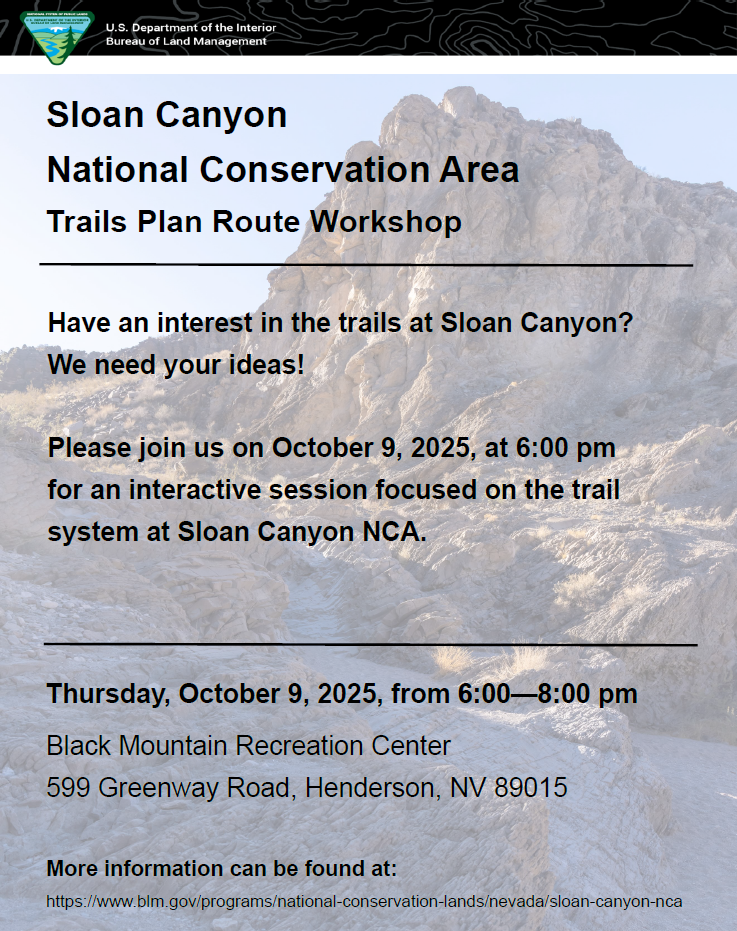 Have an interest in the trails at Sloan Canyon? We need your ideas! Please join us on October 9, 2025, at 6:00 pm for an interactive session focused on the trail system at Sloan Canyon NCA. Thursday, October 9, 2025, from 6:00—8:00 pm Black Mountain Recreation Center 599 Greenway Road, Henderson, NV 89015 More informationContinue reading →